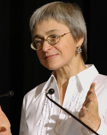 A photo taken 16 October 2002 shows journalist Anna Politkovskaya of Moscow’s Novaya Gazeta newspaper speaking in New York as she received a Courage in Journalism Award presented by the International Women’s Media Foundation. Politkovskaya was chosen by Chechen rebels holding a Moscow theater audience hostage to negotiate on their behalf 24 October 2002.
