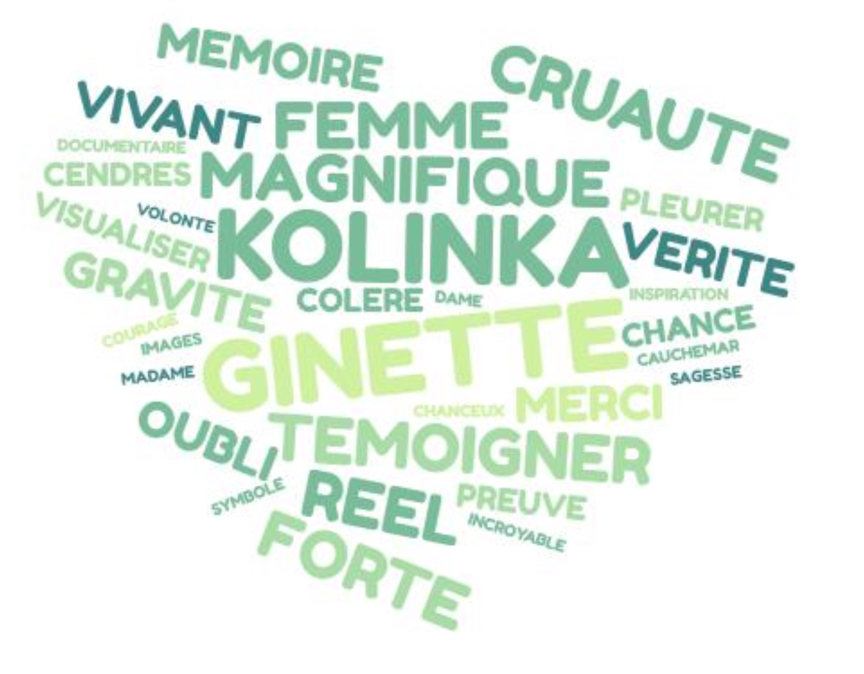 « Grâce au documentaire et au débat avec Ginette Kolinka, j’ai pu consolider mes connaissances sur la Shoah. C’était bien que les élèves aient à peu près notre âge dans le documentaire. Ginette Kolinka est une femme très forte, je suis très admirative. Merci pour la rencontre ! » Mathilde