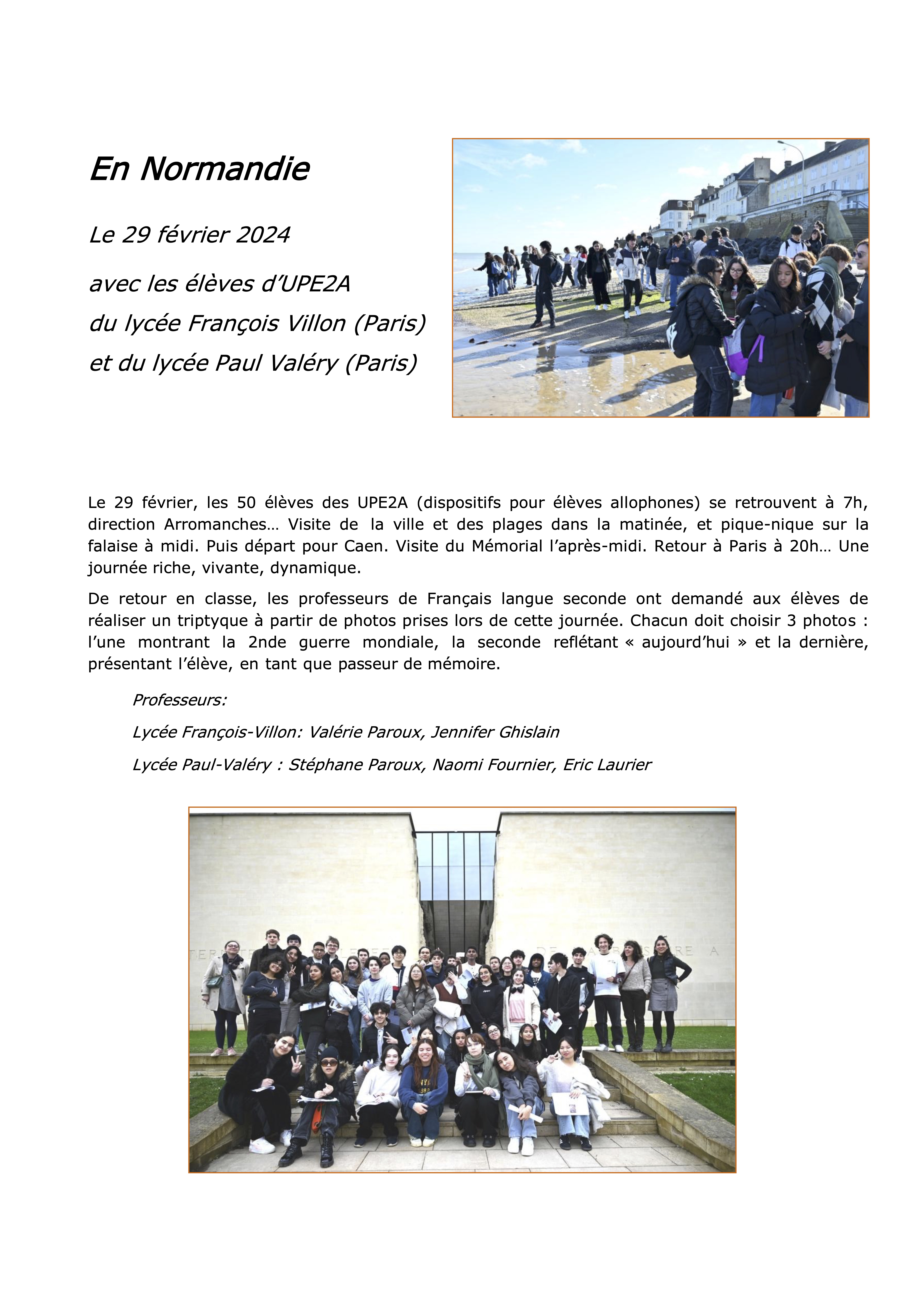 Le 29 février 2024, Mémoire 2000 a organisé un voyage au Mémorial de Caen et sur les plages du débarquement avec des élèves du Lycée Paul Valéry (Paris) et leurs professeurs, Stéphane Paroux, Naomi Fournier et Eric Laurier, et des élèves du Lycée François Villon (Paris) et leurs professeurs, Valérie Paroux et Jennifer Ghislain.