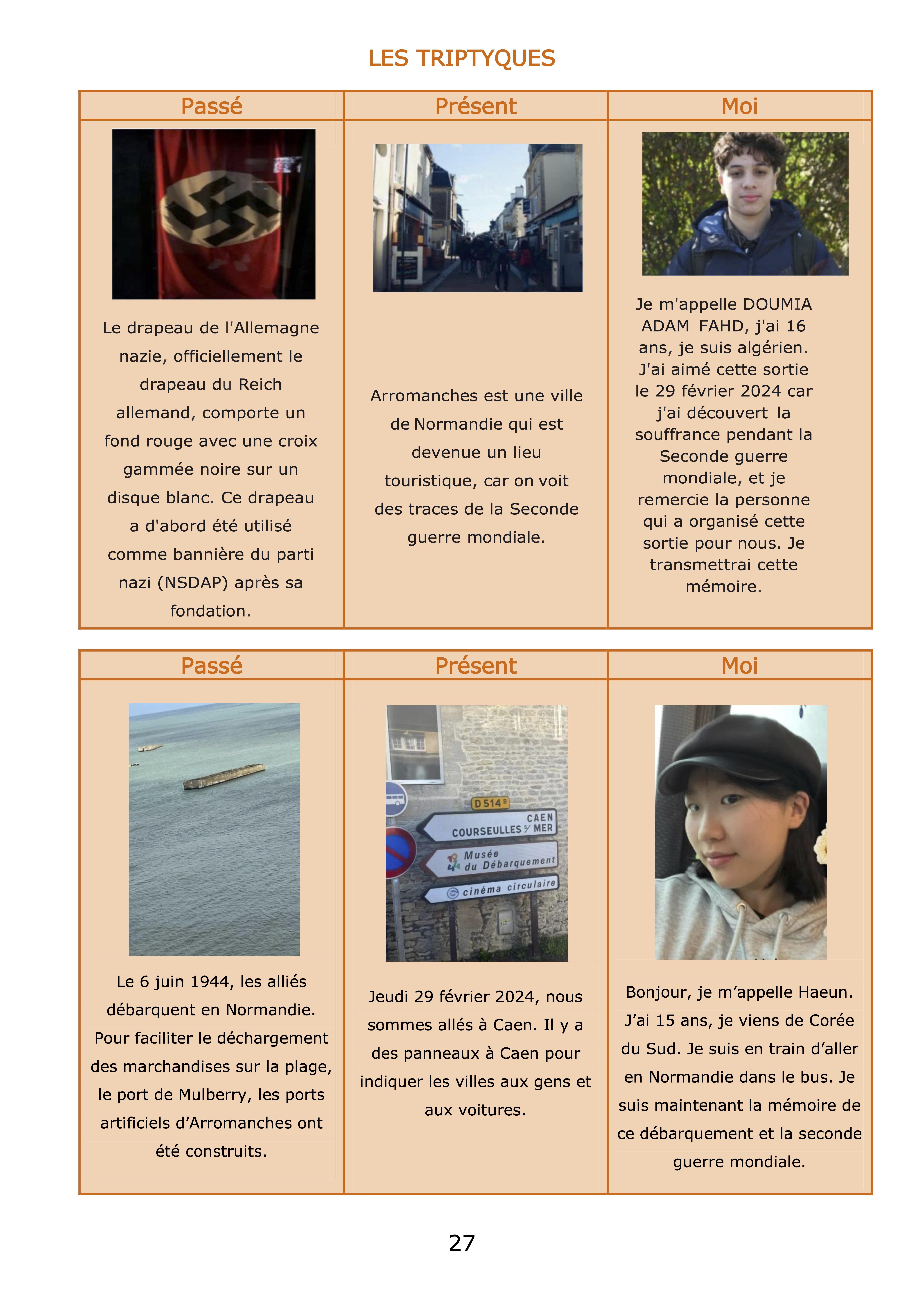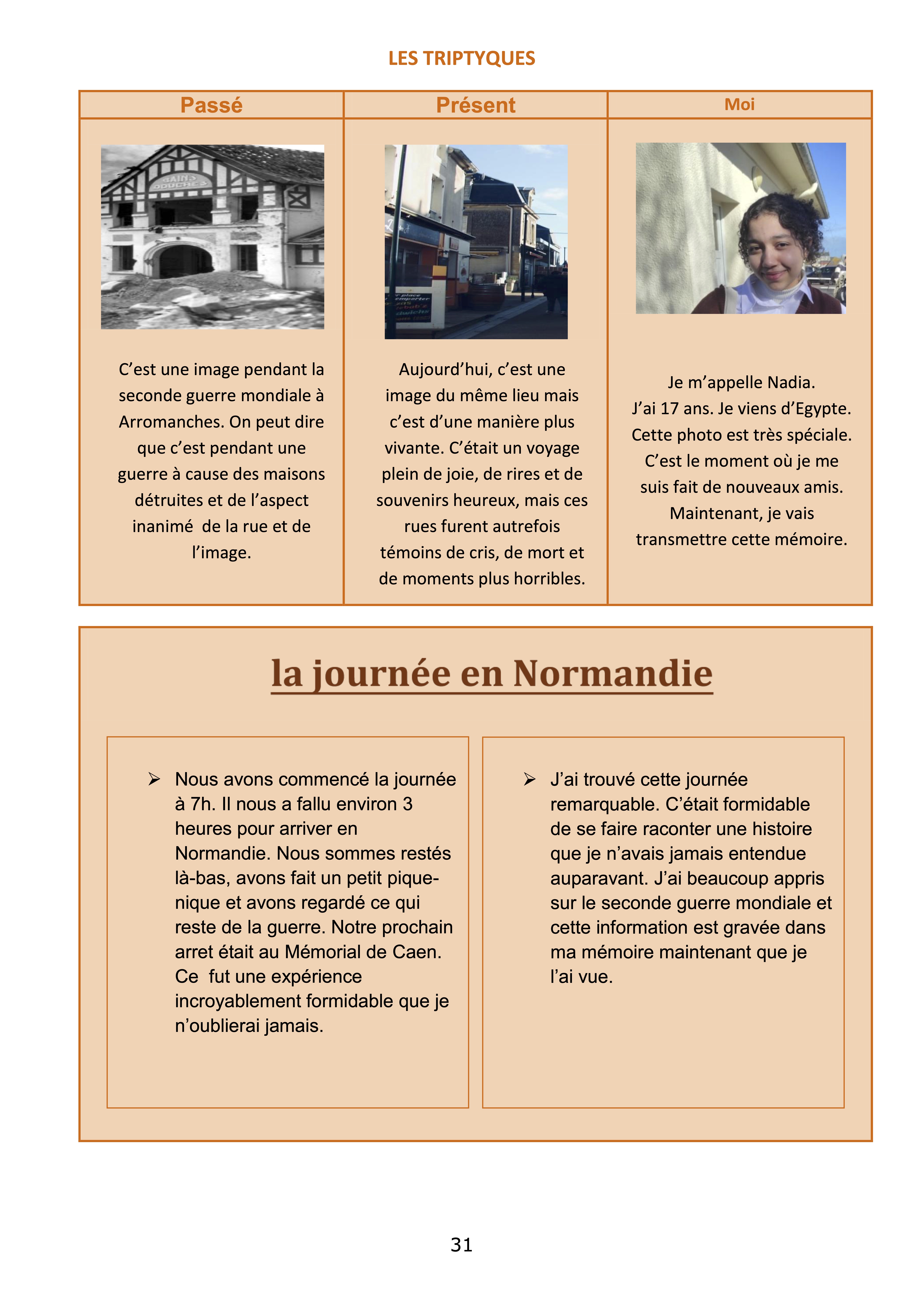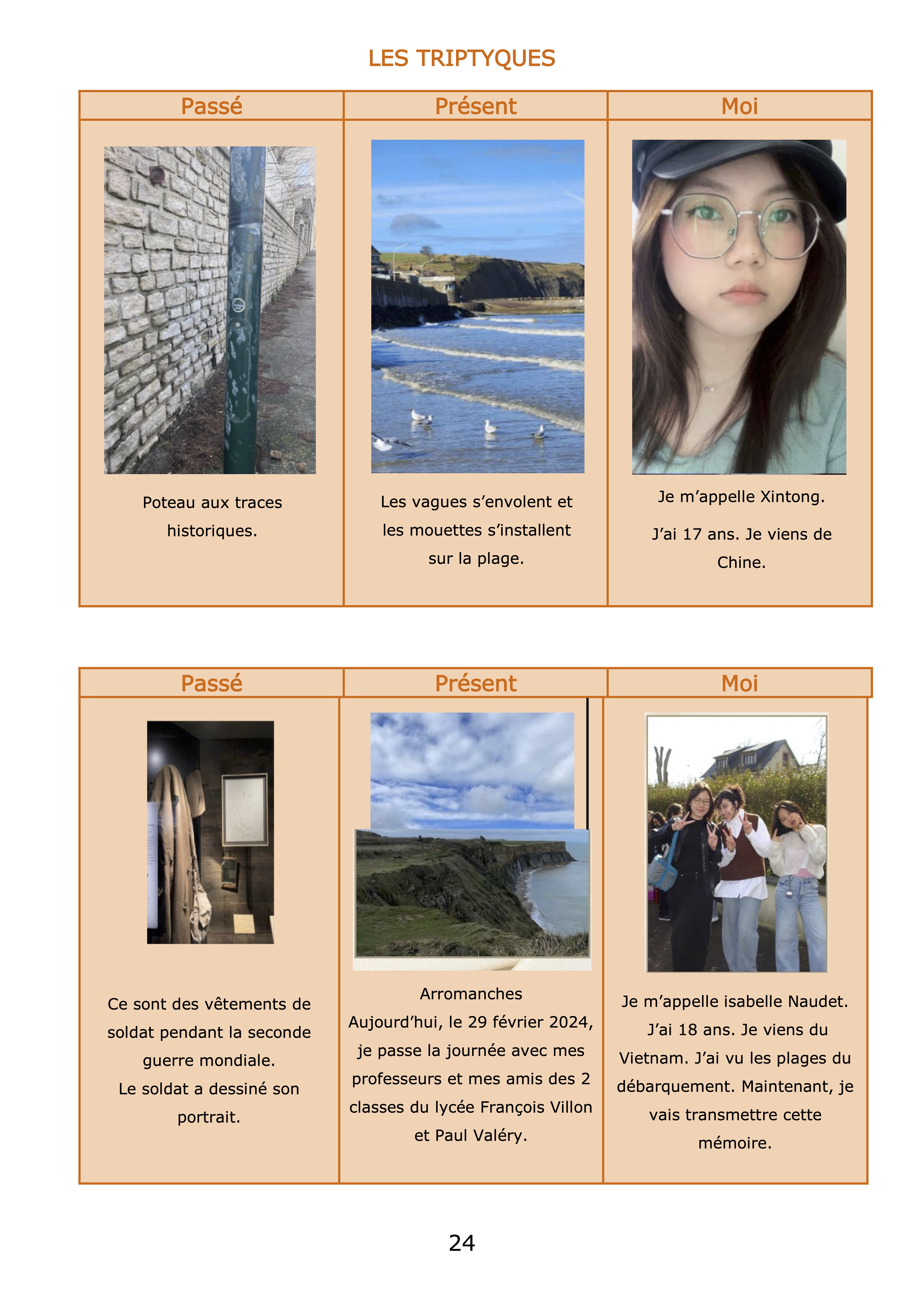 De retour en classe, les professeurs ont demandé aux élèves de réaliser un triptyque à partir des photographies prises lors du voyage. Chaque élève a choisi 3 photos : l’une montrant la seconde guerre mondiale, la seconde reflétant « aujourd’hui » et la troisième représentant l’élève en tant que passeur de mémoire.